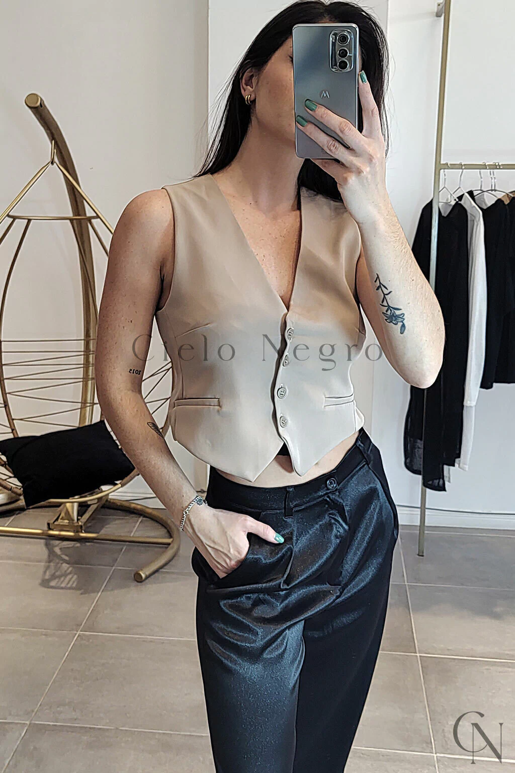 Chaleco de creppe sastrero con medialuna de niquel en la espalda.