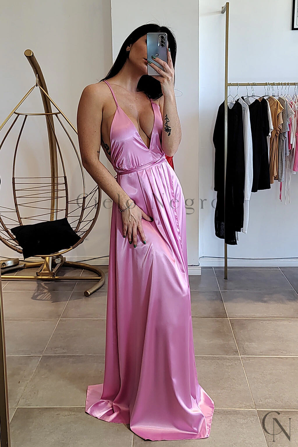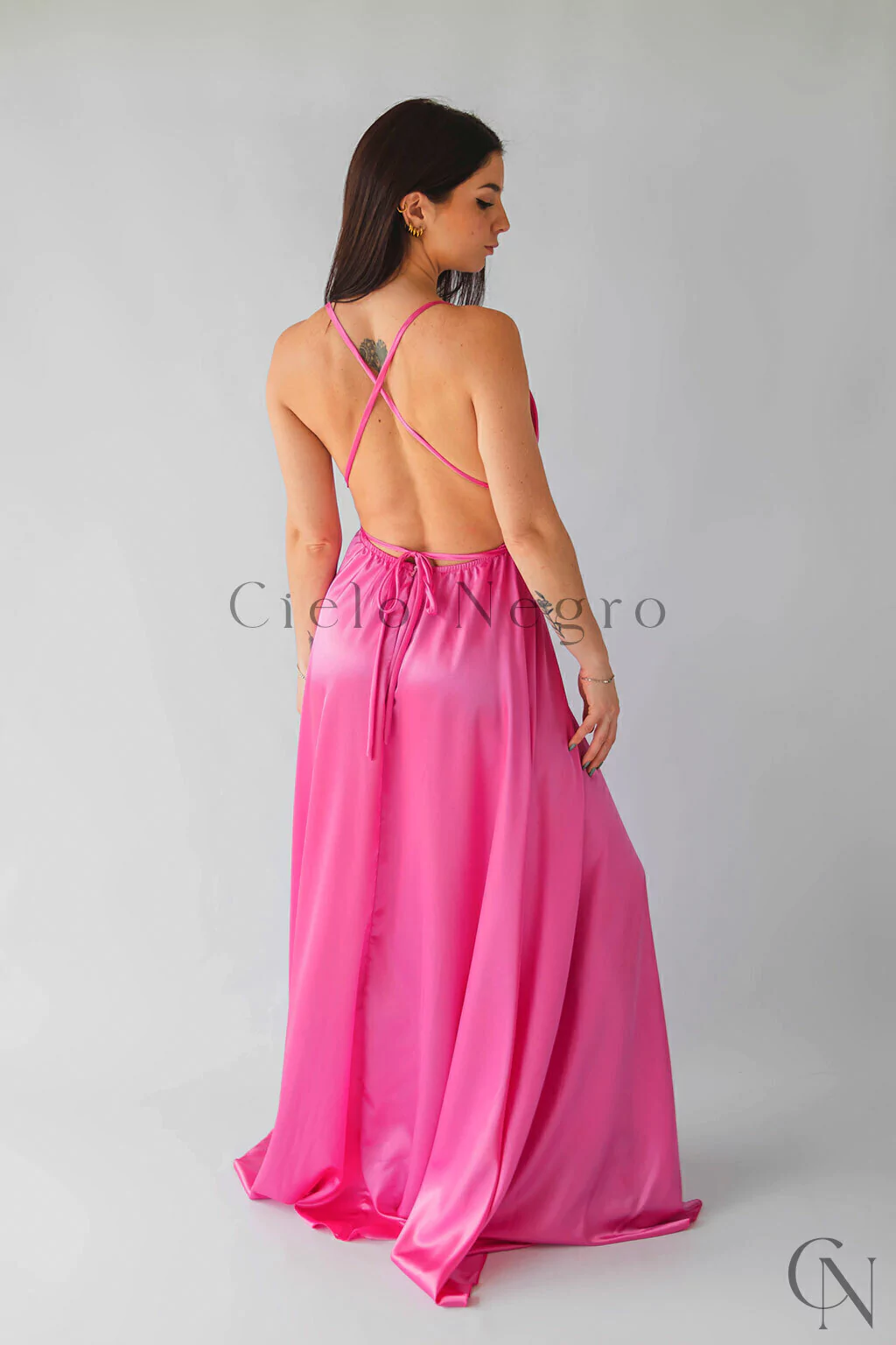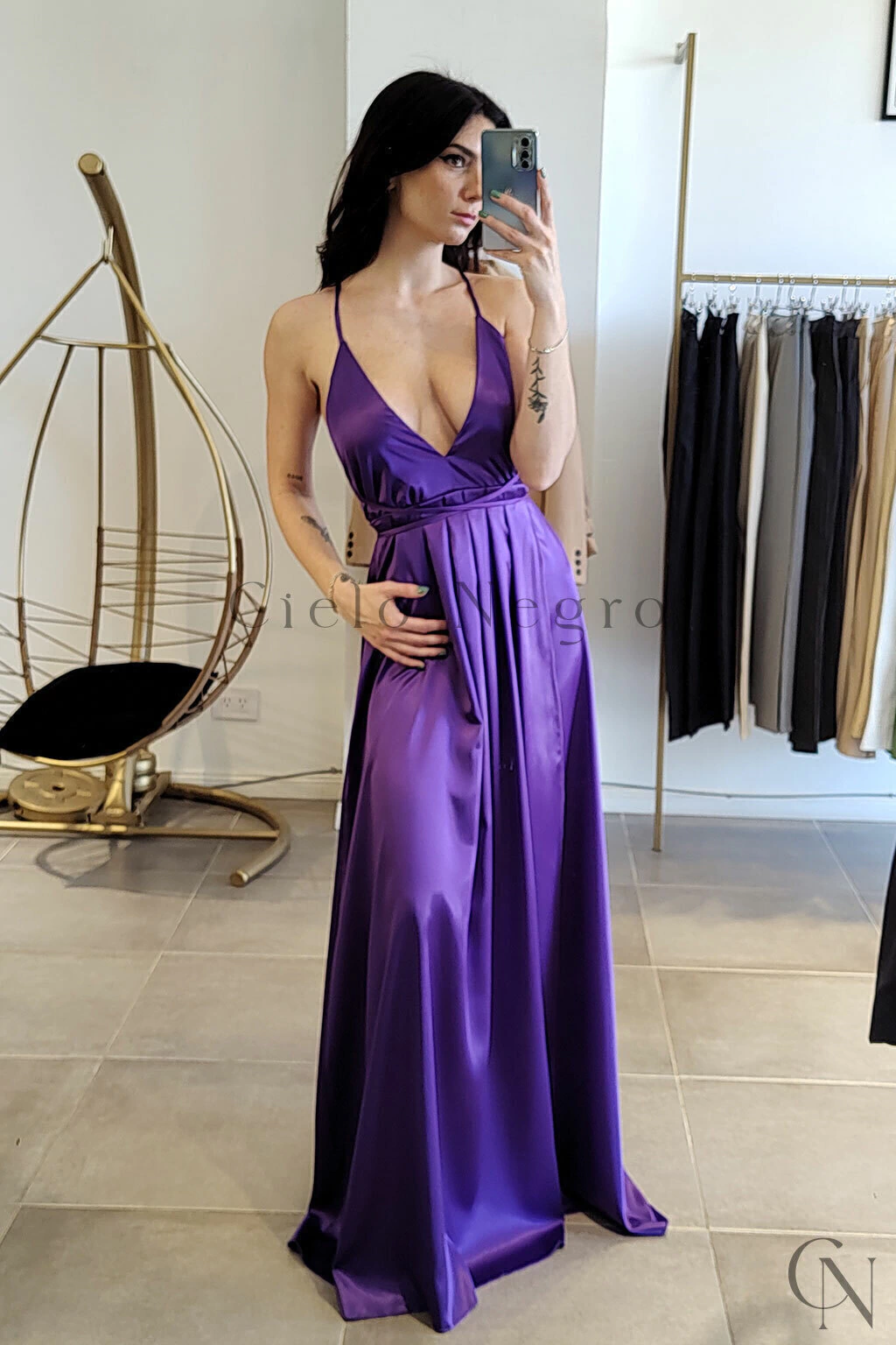 Hermoso vestido largo de saten ofrece un escote triangular y un lazo largo para crear un estilo único. Con una falda amplia con tablas delateras, cintura elástica con cierre y tajo delantero, combina comodidad y sofisticación en una sola prenda. Perfecto para cualquier evento especial.